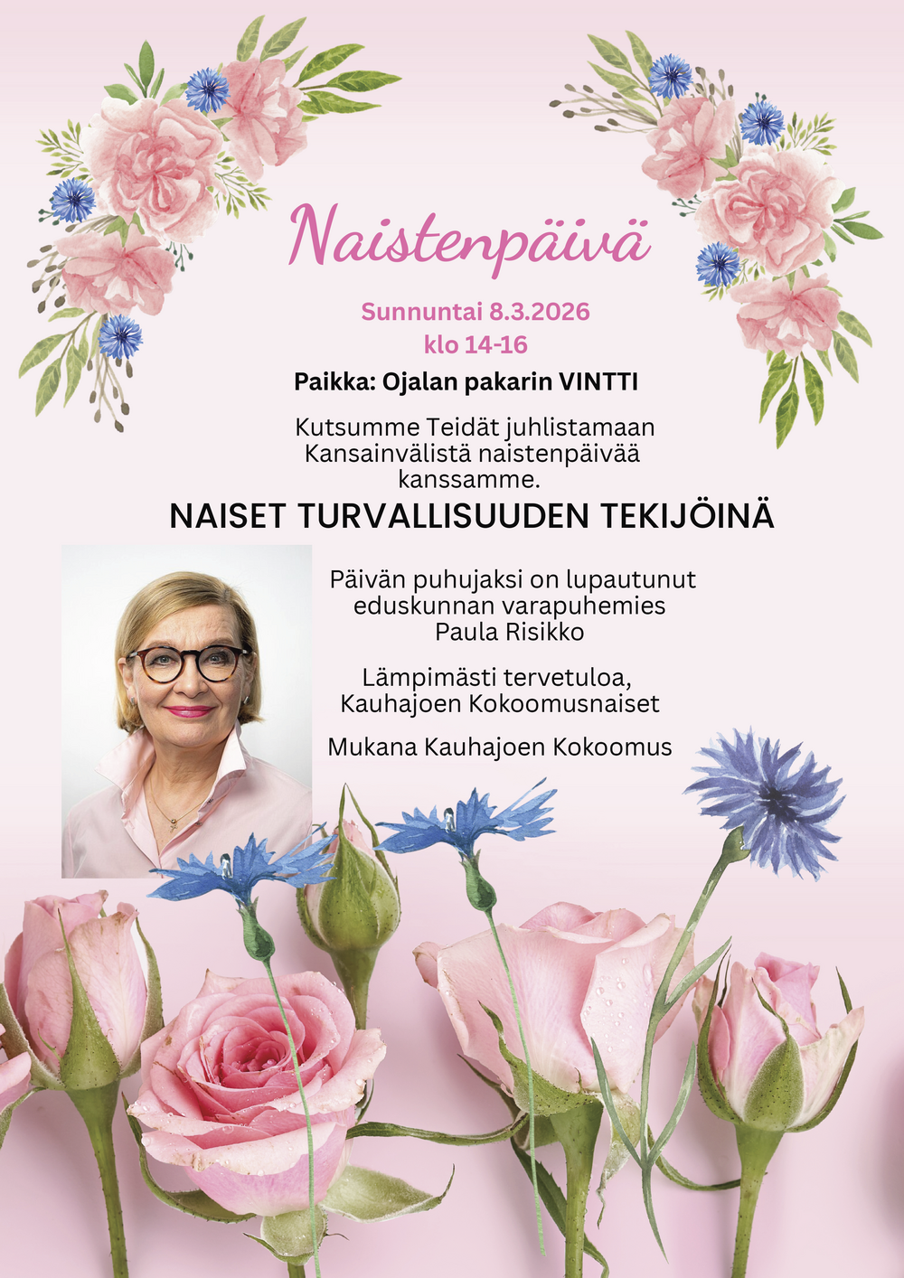 Kauhajoen kokoomusnaisten järjestämä Naistenpäivän -tilaisuus Ojalan Pakarin vintillä. Puhujana eduskunnan 1. varapuhemies Paula Risikko.